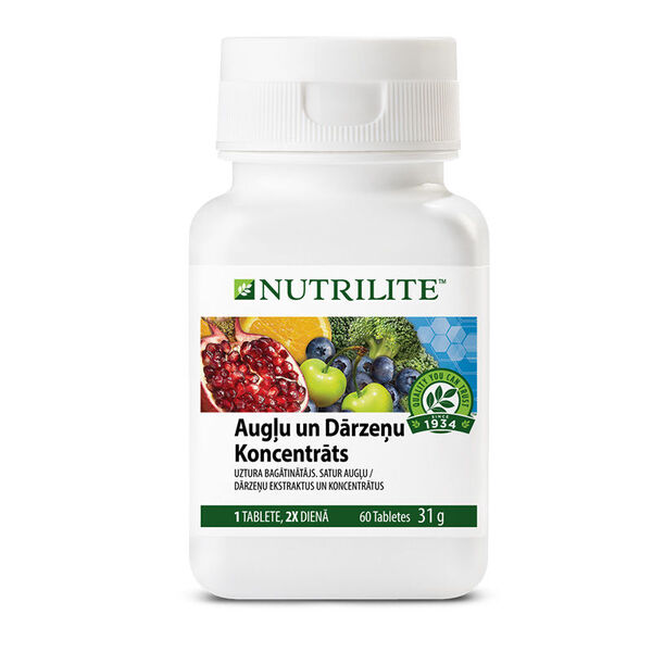 Nutrilite Augļu un dārzeņu ekstrakts ir izgatavots no zaļās tējas, granātābolu, apelsīnu, melnā plūškoka, melleņu, acerolas, brokoļu, burkānu, spinātu un tomātu ekstrakta kombinācijas.